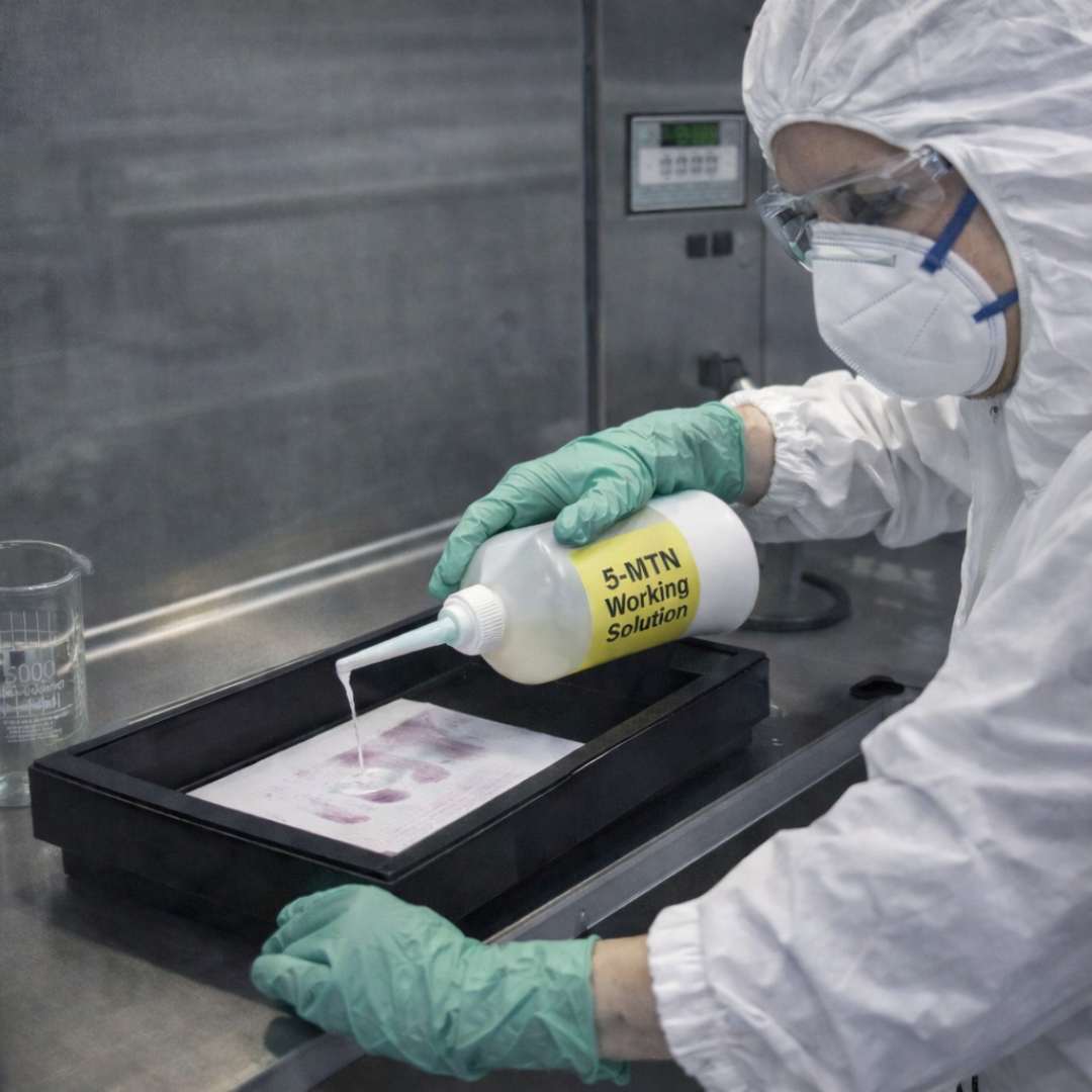 5-Methylthioninhydrin (5-MTN) is a reagent for fingerprints that combines the favorable characteristics of ninhydrin (strong colour) and those of DFO and 1,2-IND (strong fluorescence). 5-MTN-developed fingerprints have a stronger colour than those developed with regular ninhydrin. Therefore, the working solution can have a lower concentration (at 3 g per litre, the strength of the colour is about the same). After treatment with zinc chloride, 5-MTN-developed prints do not become orange, but a more reddish coloured purple. The fluorescence of the fingerprint is stronger than DFO.