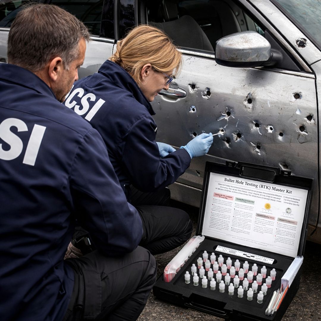 The identification of bullet holes may be very important in the investigation of criminal cases involving the use of firearms. These bullet holes are usually characterized by the presence of metals (mainly lead and copper) originating from a bullet’s outer surfaces in the margins of these holes. Using our Bullet Hole Testing (BTK) Master Kit can help the investigator identify the caliber and direction from which the bullet was fired.