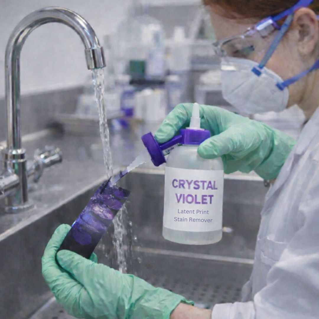 Use Crystal Violet to develop latent fingerprints on the adhesive side of almost any kind of tape, e.g., Scotch, electrical, Kraft, etc. Mix the powder in water, soak the tape in the solution and rinse with running tap water. The problem of working with Crystal Violet powder or solution is that it is a very messy dye and will stain skin, clothes, floors and counter tops. It may be very difficult, if not impossible, to remove the stains from some clothing, furniture and floor covering. Crystal Violet is also often used as a “theft detection powder.” Firstly the item is first VERY lightly dusted with the powder and when the item comes into contact with moisture (for example, the thief’s hands), it turns dark purple and stains anything that comes into contact with it. However, this use is NOT suggested due to the messy nature of the product and the fact that the stains DO NOT come out of most surfaces. Shelf-life of Crystal Violet powder: indefinite. The working solution should not be kept much longer than 3-6 months. While older solutions may continue to work, the results might not be as good.