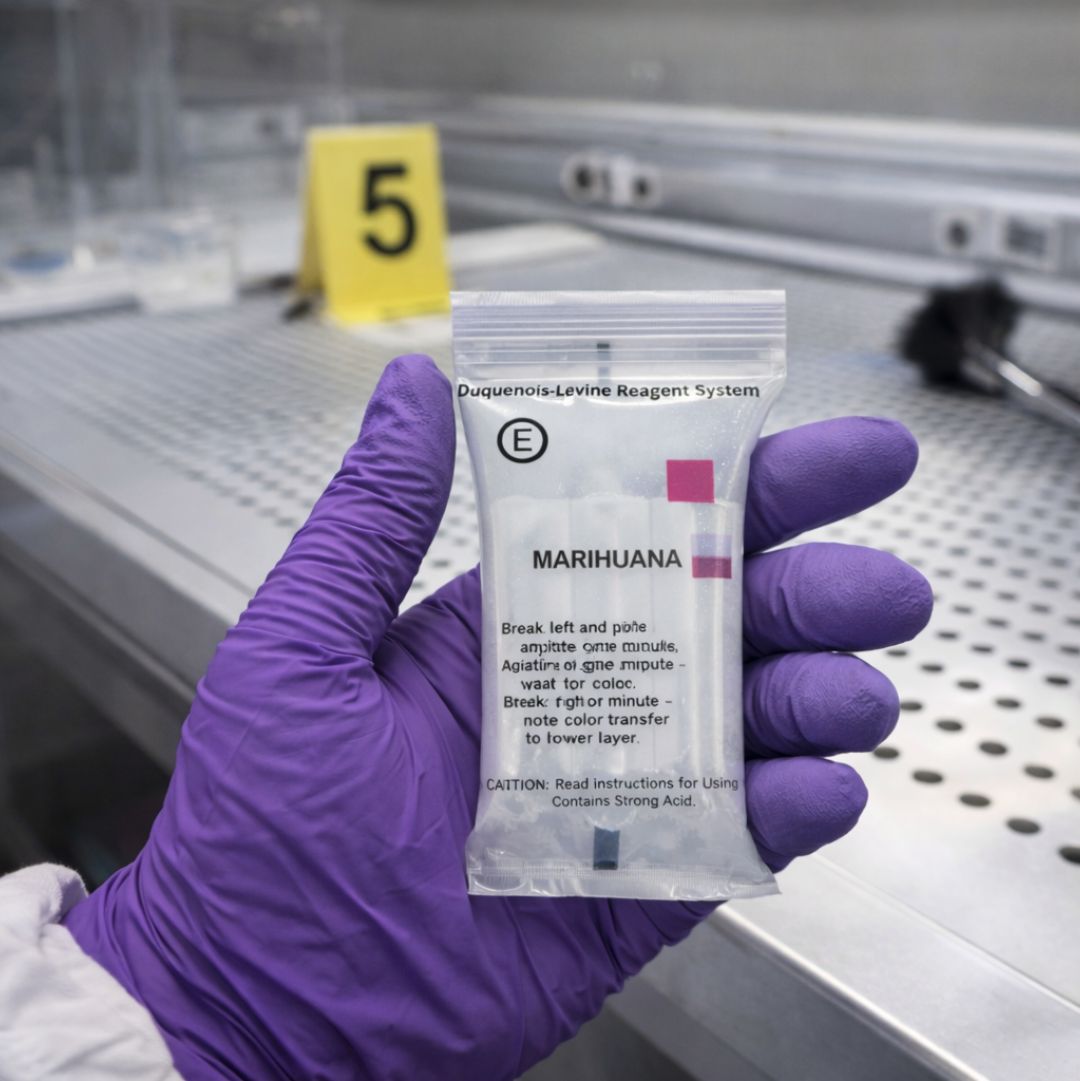 The NIK Marijuana Test (Test E) uses the specialised D-L Reagent to provide a definitive presumptive identification of cannabinoids in Cannabis Sativa plant material. As a standalone test, it allows law enforcement and forensic teams to identify marijuana, hashish, and hash oil quickly. Because different strains can vary in appearance, this three-stage chemical reaction provides the objective evidence needed for field documentation and the filing of criminal charges.