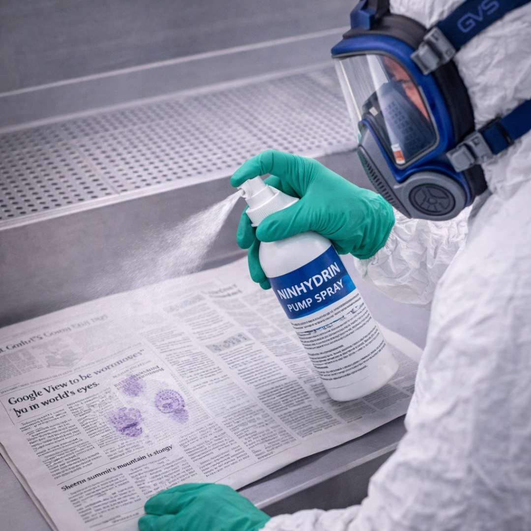 This formulation of Ninhydrin will not run most inks, with this bottle you have the option of unscrewing the lid, pouring the solution into a tray and dipping paper evidence for maximum saturation and superior development of latent prints. This solution is hazardous and must be sprayed in a fume hood and stored inside a flammable liquids cabinet.