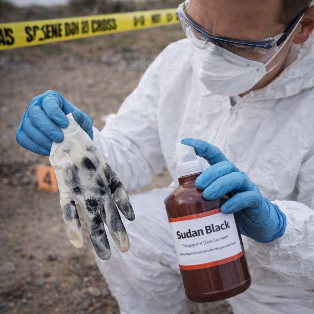 Sudan Black is one of the best processes for developing latent prints on smooth or rough, nonporous surfaces contaminated with greasy or sticky substances. It works best on glass, metal or plastic materials and can be used on waxy surfaces, such as candles or wax-paper milk cartons. Sudan Black stains the fatty components of sebaceous secretions from the skin. Try this process on the inside of those latex gloves left behind at the scene of a burglary. Sudan Black is easy-to-use, inexpensive and nontoxic.